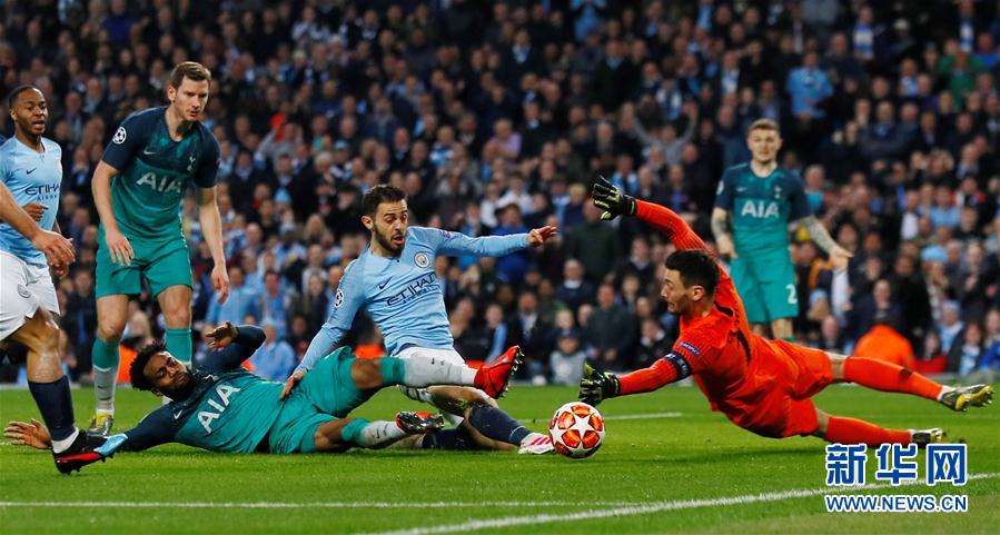 4月17日,曼城队球员席尔瓦(左四)和热刺队球员罗斯(左三)在门前拼抢。 当日,在2018-2019赛季欧洲足球冠军联赛四分之一决赛次回合的比赛中,英超托特纳姆热刺队客场以3比4不敌英超曼彻斯特城队,双方总比分战成4比4平,热刺队以客场进球多的优势晋级四强。 新华社/路透