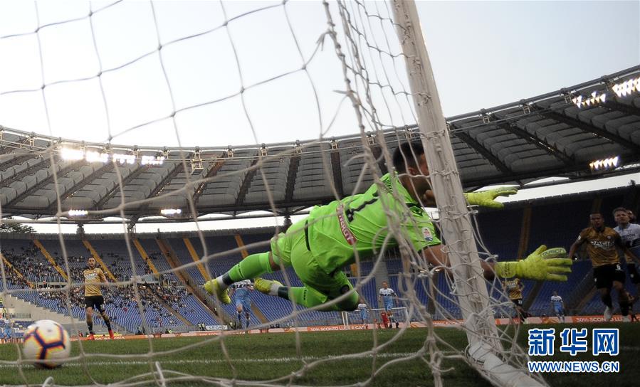 4月17日,乌迪内斯队守门员穆索(前)在比赛中未能扑出拉齐奥队球员凯塞多的射门。 当日,在2018-2019赛季意大利足球甲级联赛第25轮补赛中,拉齐奥队主场以2比0战胜乌迪内斯队。 新华社发(阿尔贝托·林格里亚摄)