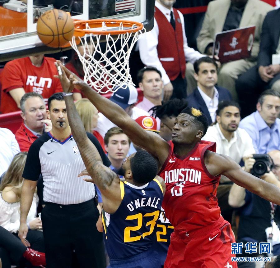 4月17日,火箭队球员卡佩拉(右)在比赛中防守爵士队球员奥尼尔。 当日,在2018-2019赛季NBA季后赛首轮第二场比赛中,休斯敦火箭队主场以118比98战胜犹他爵士队,目前以2比0的总比分暂时领先。 新华社发(宋穹摄)