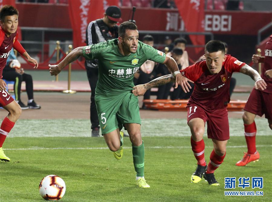 4月20日,北京中赫国安队球员奥古斯托(左)和河北华夏幸福队球员姜至鹏在比赛中拼抢。 当日,在2019赛季中超联赛第六轮比赛中,河北华夏幸福队主场以0比1不敌北京中赫国安队。 新华社发(周洋摄)