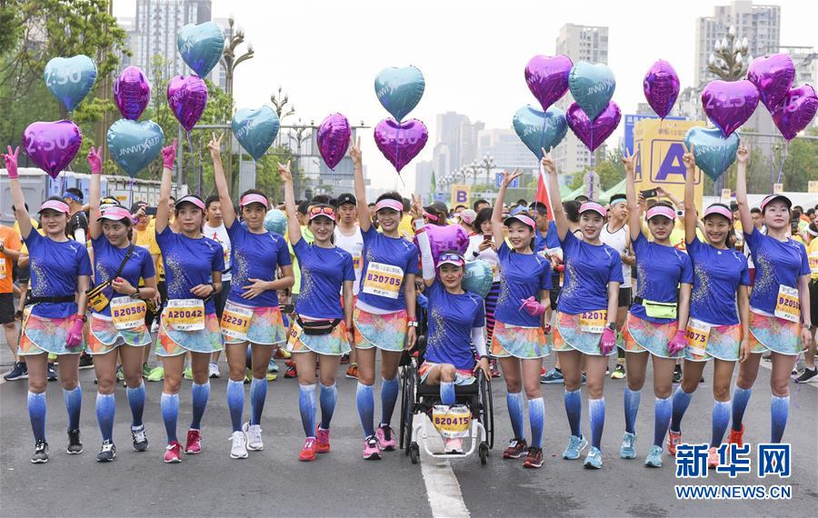 4月21日,参赛选手在比赛前合影留念。 当日,2019“金温江”半程马拉松赛在成都市温江区光华大道鸣枪开跑,共有来自11个国家和地区的1.4万余名选手参赛。 新华社发(张可凡摄)