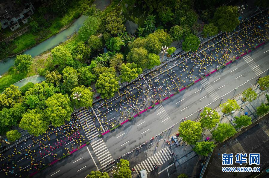 4月21日,参赛选手在比赛中。(无人机拍摄) 当日,2019“金温江”半程马拉松赛在成都市温江区光华大道鸣枪开跑,共有来自11个国家和地区的1.4万余名选手参赛。 新华社发(张可凡摄)