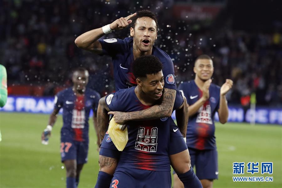 4月21日,巴黎圣日耳曼队球员内马尔(前上)、金彭贝(前下)庆祝夺冠。 当日,在2018-2019赛季法国足球甲级联赛第33轮比赛中,巴黎圣日耳曼队主场以3比1战胜摩纳哥队,提前五轮夺得本赛季联赛冠军,成功卫冕。 新华社发(杰克·陈摄)