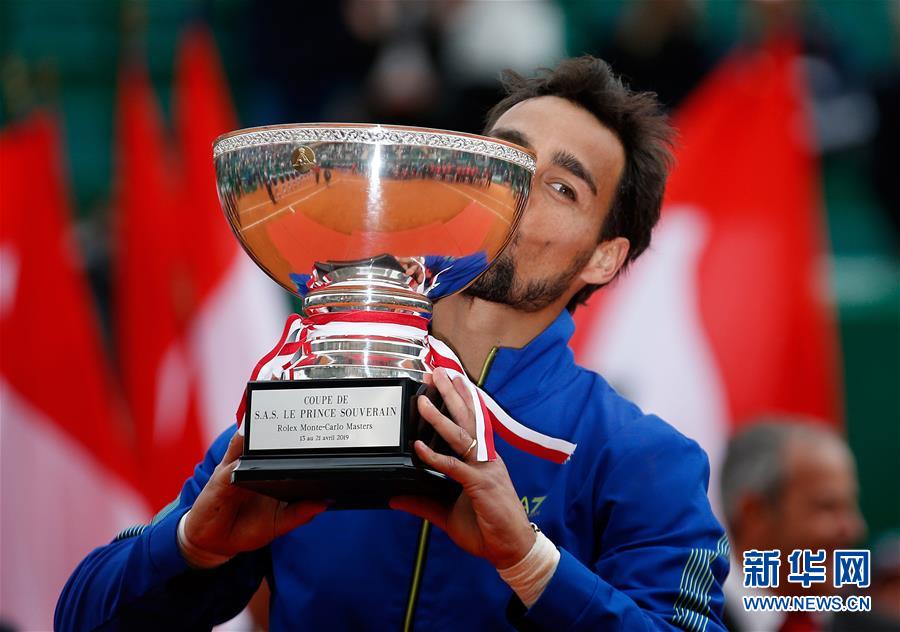 4月21日,弗格尼尼亲吻冠军奖杯。 当日,在2019ATP蒙特卡洛大师赛男子单打决赛中,意大利选手弗格尼尼以2比0战胜塞尔维亚选手拉约维奇,获得冠军。 新华社发(尼古拉·马里摄)