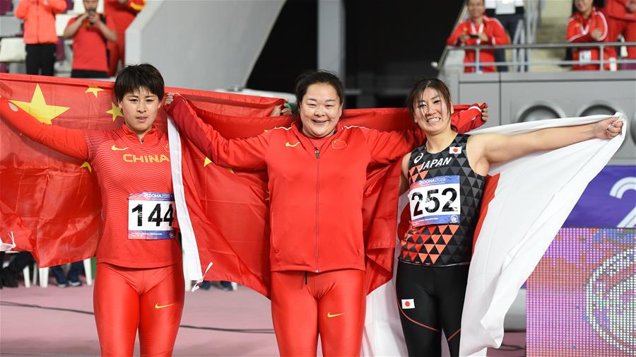 4月22日,中国选手王峥(中)、罗娜(左)和日本选手渡边茜在比赛后庆祝。 当日,在第23届亚洲田径锦标赛女子链球决赛中,中国选手王峥和罗娜分别以75米66和72米23的成绩夺得冠亚军。日本选手渡边茜以63米54的成绩获得铜牌。 新华社记者邬惠我摄