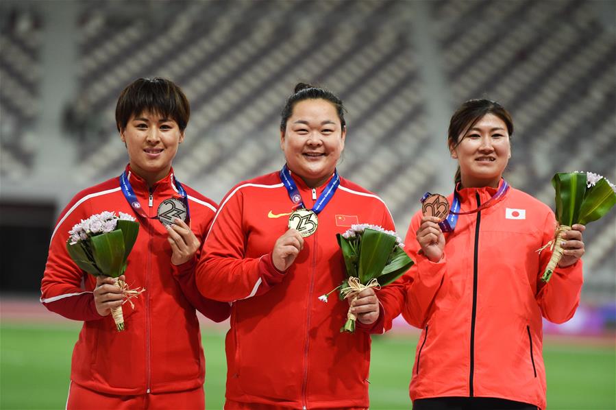 4月22日,冠军中国选手王峥(中)、亚军罗娜(左)和季军日本选手渡边茜在颁奖仪式上合影。 当日,在第23届亚洲田径锦标赛女子链球决赛中,中国选手王峥和罗娜分别以75米66和72米23的成绩夺得冠亚军。日本选手渡边茜以63米54的成绩获得铜牌。 新华社记者邬惠我摄