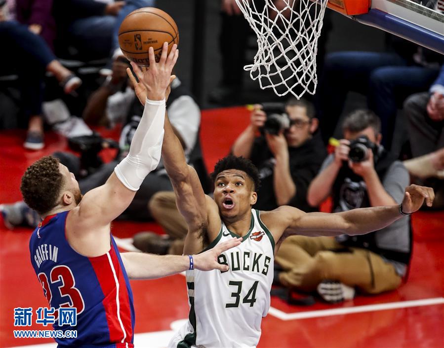 4月22日,雄鹿队球员安特托昆博(右)在比赛中防守。 当日,在2018-2019赛季NBA首轮季后赛东部赛区第四场比赛中,密尔沃基雄鹿队客场以127比104战胜底特律活塞队,以4比0的总比分晋级季后赛第二轮。 新华社发(乔尔·莱纳摄)
