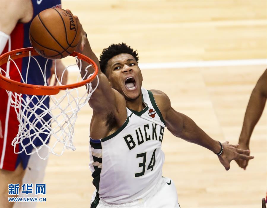 4月22日,雄鹿队球员安特托昆博在比赛中扣篮。 当日,在2018-2019赛季NBA首轮季后赛东部赛区第四场比赛中,密尔沃基雄鹿队客场以127比104战胜底特律活塞队,以4比0的总比分晋级季后赛第二轮。 新华社发(乔尔·莱纳摄)