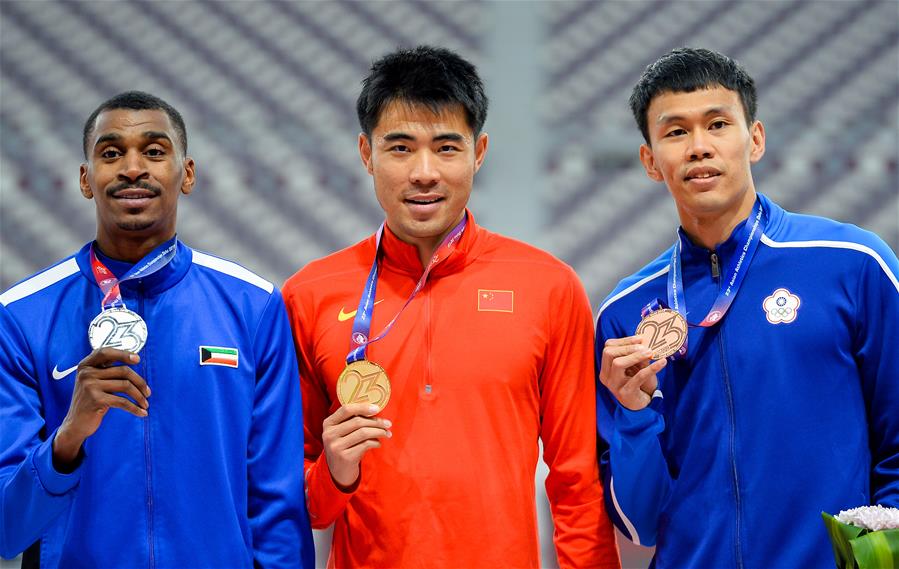 4月24日,冠军中国选手谢文骏(中)、亚军科威特选手阿尔尤哈(左)和季军中国台北选手陈奎儒在颁奖台上。 当日,在多哈举行的第23届亚洲田径锦标赛男子110米栏决赛中,中国选手谢文骏以13秒21的成绩打破赛会纪录并夺得冠军。 新华社发(尼库摄)