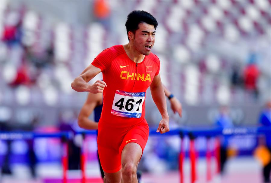 4月24日,中国选手谢文骏在冲过终点后庆祝。 当日,在多哈举行的第23届亚洲田径锦标赛男子110米栏决赛中,中国选手谢文骏以13秒21的成绩打破赛会纪录并夺得冠军。 新华社发(尼库摄)