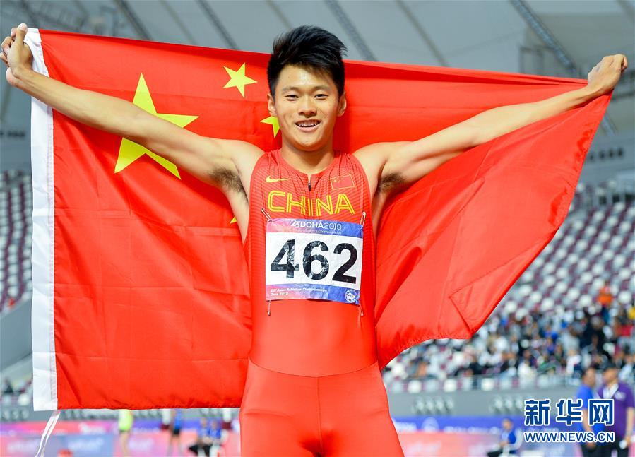 4月24日,中国选手谢震业在夺冠后庆祝。 当日,在多哈举行的第23届亚洲田径锦标赛男子200米决赛中,中国选手谢震业以20秒33的成绩夺得冠军。 新华社发(尼库摄)