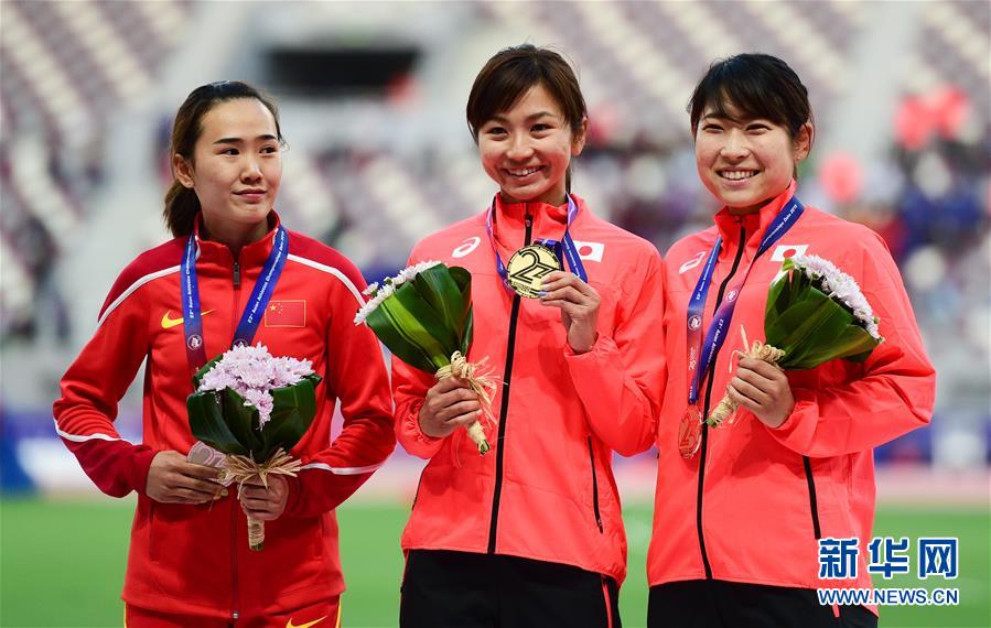 4月24日,冠军日本选手木村文子(中)、亚军中国选手陈佳敏(左)和季军日本选手青木益未在颁奖仪式上。 当日,在多哈举行的第23届亚洲田径锦标赛女子100米栏决赛中,日本选手木村文子以13秒13的成绩夺得冠军。 新华社记者邬惠我摄