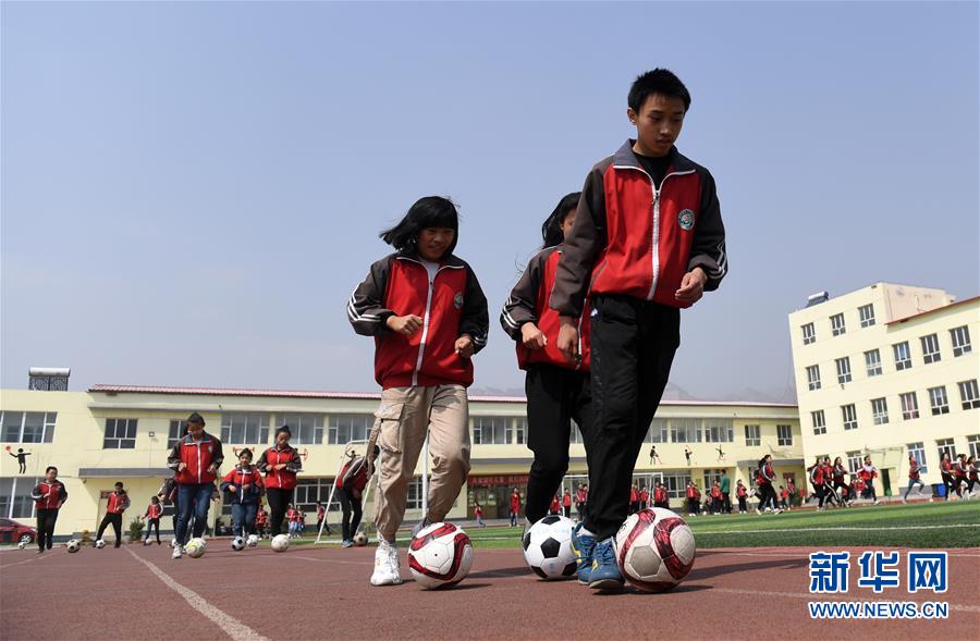 这是学生们在练习带球(4月18日摄)。 新华社记者李俊东摄