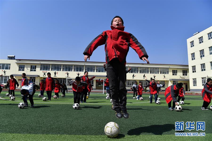 这是学生们在体育课上进行足球训练(4月16日摄)。 新华社记者詹彦摄