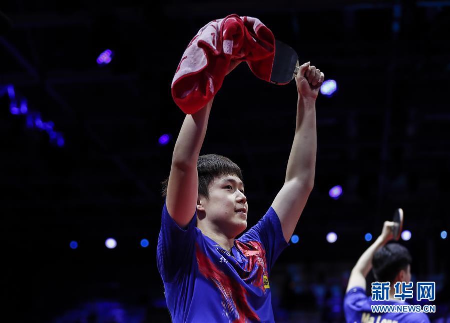 4月27日,马龙/王楚钦(左)庆祝胜利。 当日,在匈牙利布达佩斯进行的2019世界乒乓球锦标赛男子双打决赛中,中国选手马龙/王楚钦以4比1战胜跨国组合约内斯库(罗马尼亚)/罗布勒斯(西班牙),夺得冠军。 新华社记者韩岩摄