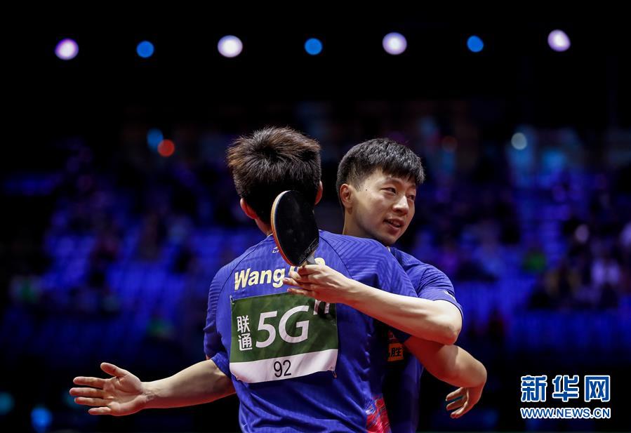 4月27日,马龙(右)/王楚钦在获胜后庆祝。 当日,在匈牙利布达佩斯进行的2019世界乒乓球锦标赛男子双打决赛中,中国选手马龙/王楚钦以4比1战胜跨国组合约内斯库(罗马尼亚)/罗布勒斯(西班牙),夺得冠军。 新华社记者韩岩摄