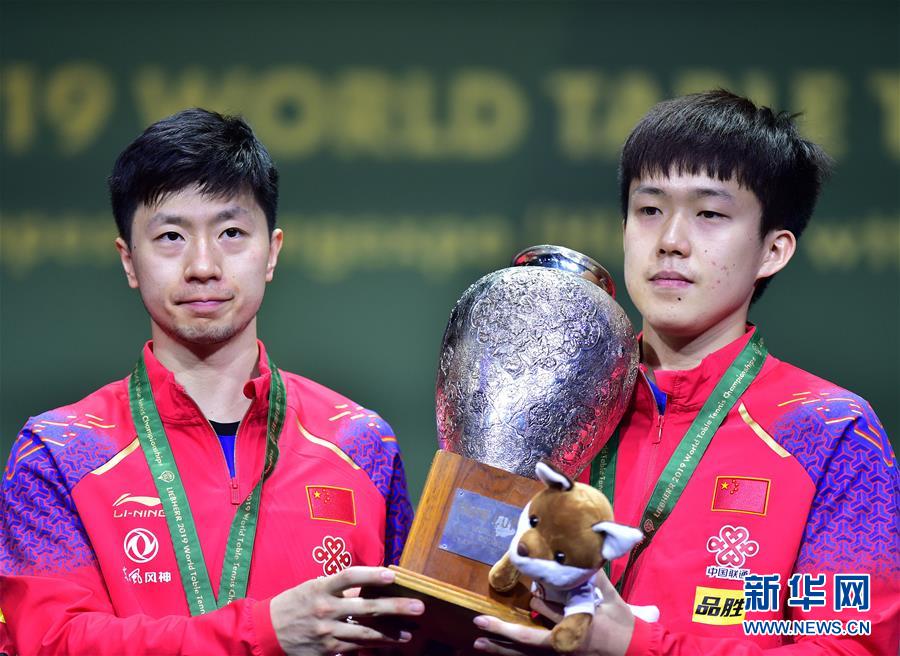 4月27日,马龙(左)/王楚钦在颁奖仪式上。 当日,在匈牙利布达佩斯进行的2019世界乒乓球锦标赛男子双打决赛中,中国选手马龙/王楚钦以4比1战胜跨国组合约内斯库(罗马尼亚)/罗布勒斯(西班牙),夺得冠军。 新华社记者逯阳摄