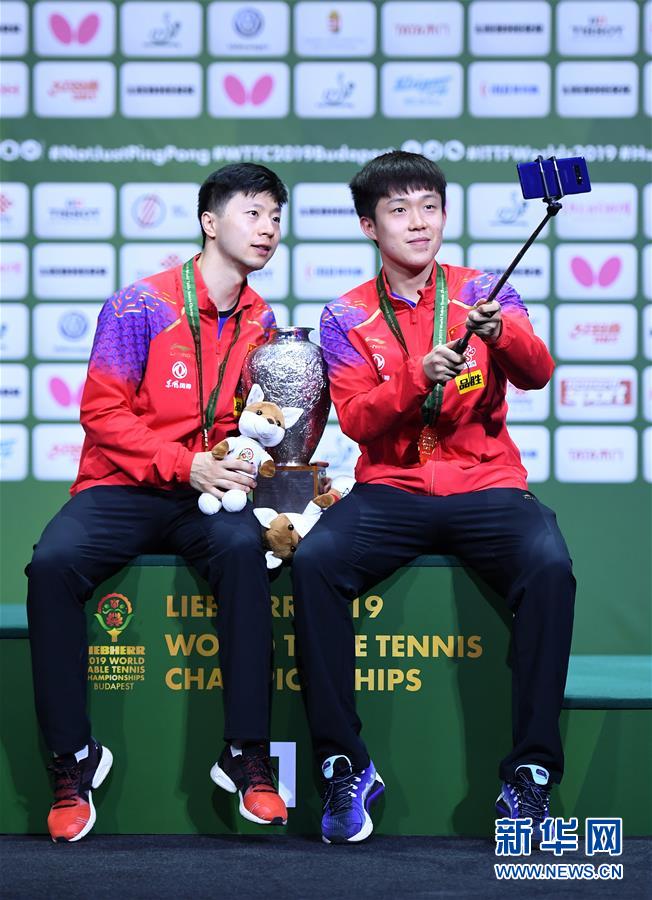 4月27日,马龙(左)/王楚钦在颁奖仪式上自拍。 当日,在匈牙利布达佩斯进行的2019世界乒乓球锦标赛男子双打决赛中,中国选手马龙/王楚钦以4比1战胜跨国组合约内斯库(罗马尼亚)/罗布勒斯(西班牙),夺得冠军。 新华社记者逯阳摄