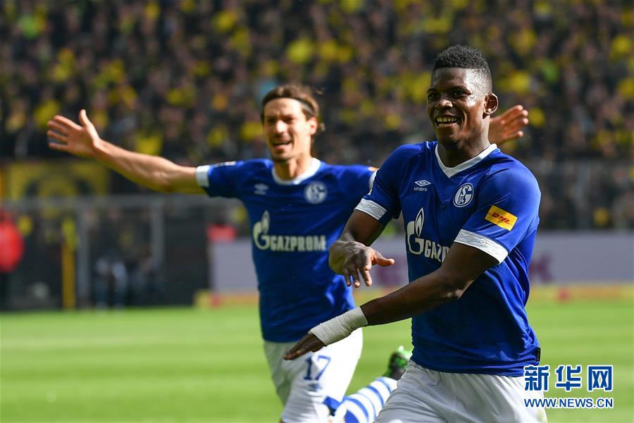 4月27日,沙尔克04队球员恩博洛(右)在比赛中庆祝进球。 当日,在2018-2019赛季德国足球甲级联赛第31轮比赛中,多特蒙德队主场以2比4不敌沙尔克04队。 新华社发(约阿希姆·毕瓦勒兹摄)