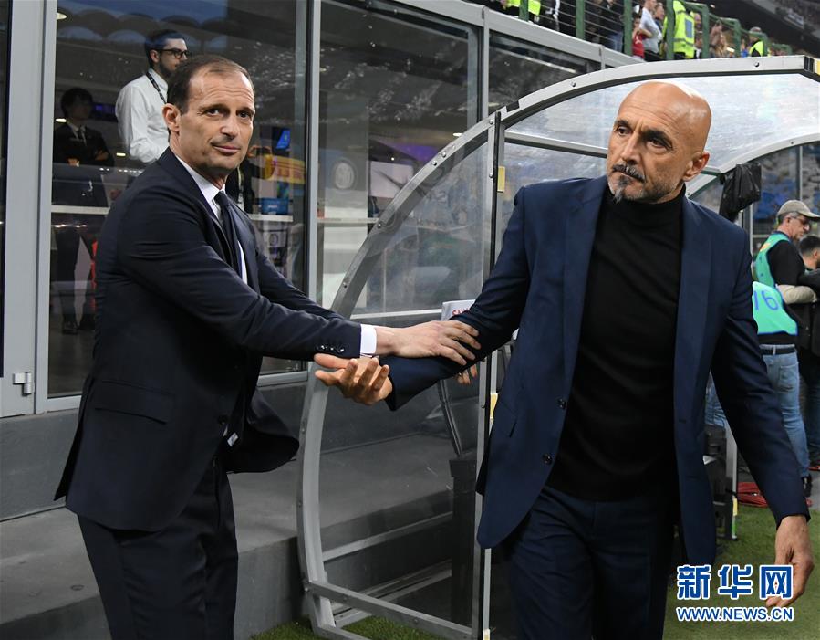 4月27日,国际米兰队主教练斯帕莱蒂(右)与尤文图斯队主教练阿莱格里在赛前握手致意。 当日,在2018-2019赛季意大利足球甲级联赛第34轮比赛中,国际米兰队主场以1比1战平已经提前夺冠的尤文图斯队。 新华社发(阿尔贝托·林格里亚摄)