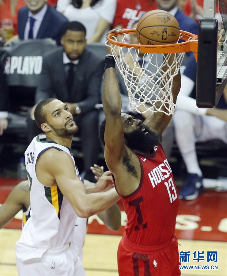 4月24日,火箭队球员哈登(右)在比赛中扣篮。 当日,在2018-2019赛季NBA西部季后赛第五场比赛中,休斯敦火箭队主场以100比93战胜犹他爵士队,以总比分4比1晋级半决赛。 新华社发(宋穹摄)