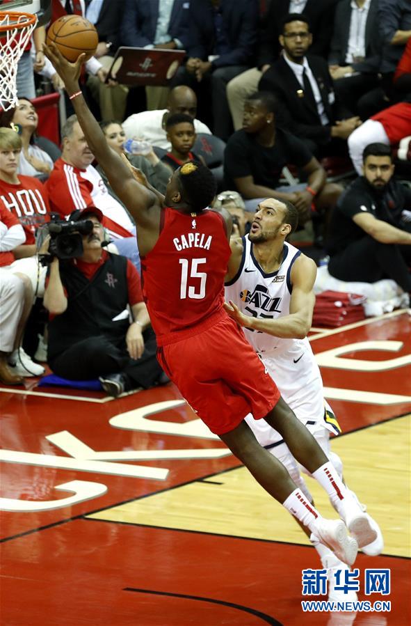 4月24日,火箭队球员卡佩拉(左)在比赛中上篮。 当日,在2018-2019赛季NBA西部季后赛第五场比赛中,休斯敦火箭队主场以100比93战胜犹他爵士队,以总比分4比1晋级半决赛。 新华社发(宋穹摄)