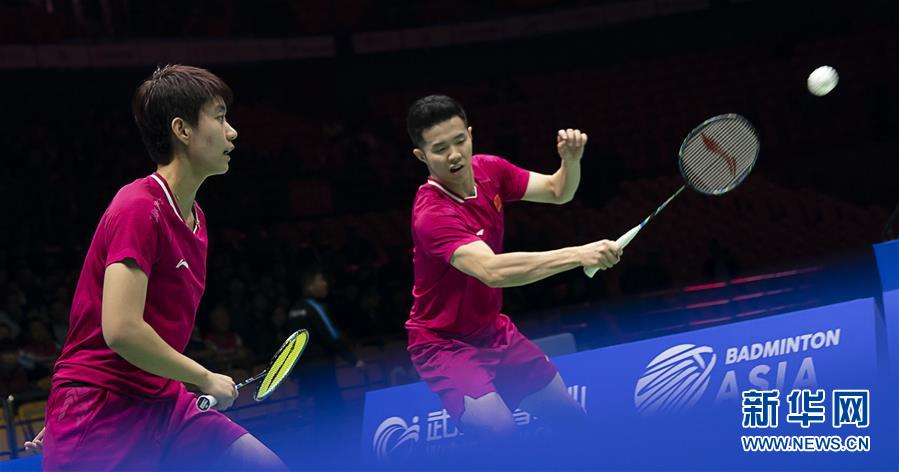 4月28日,何济霆(右)/杜玥在比赛中。 当日,在湖北武汉进行的2019年亚洲羽毛球锦标赛混双决赛中,中国组合王懿律/黄东萍以2比1战胜队友何济霆/杜玥,夺得冠军。 新华社记者 熊琦 摄