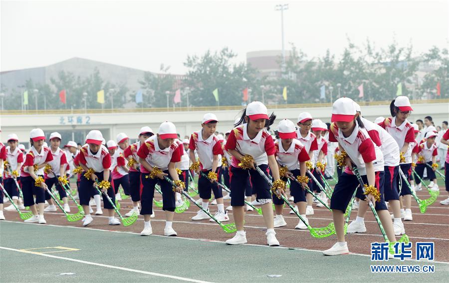 4月29日,小学生在展示旱地冰球。 当日,北京市东城区崇文小学“锻炼体质 追逐梦想”亲情体育节在北京经济技术开发区体育中心举行,师生、家长共3000余人参加。 新华社发(周良 摄)