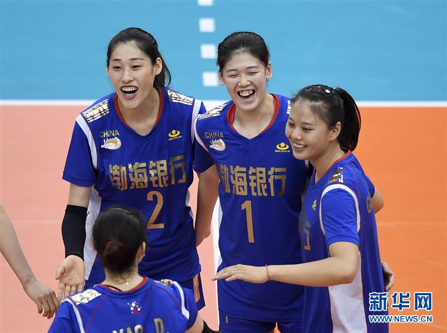 4月29日,天津女排球员李盈莹(右二)、龚翔宇(右一)和刘晓彤(左一)比赛中庆祝得分。 当日,在天津武清体育中心举行的2019亚洲女排俱乐部锦标赛A组小组赛中,天津女排以3比0战胜中国台北女排。 新华社记者岳月伟摄