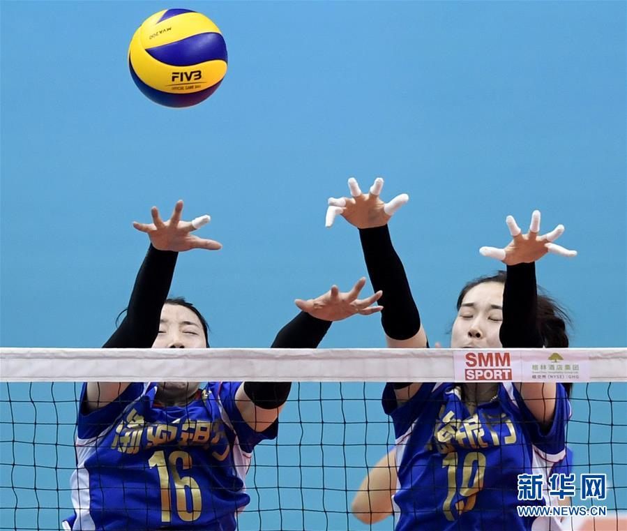 4月29日,天津女排球员姚笛(左)和李雅楠比赛中拦网。 当日,在天津武清体育中心举行的2019亚洲女排俱乐部锦标赛A组小组赛中,天津女排以3比0战胜中国台北女排。 新华社记者岳月伟摄