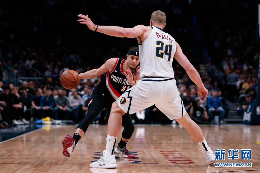 4月29日,开拓者队球员赛斯·库里(左)在比赛中带球突破。 当日,在2018-2019赛季NBA季后赛西部半决赛首轮比赛中,丹佛掘金队主场以121比113战胜波特兰开拓者队,总比分1比0领先。 新华社/路透