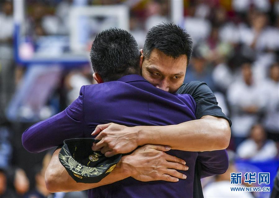 5月3日,广东东莞银行队球员易建联(右)在比赛结束后与主教练杜锋拥抱。 当日,在2018-2019赛季中国男子篮球职业联赛(CBA)总决赛第四回合比赛中,广东东莞银行队客场以103比98战胜新疆广汇汽车队,夺得总决赛冠军。 新华社记者王菲摄
