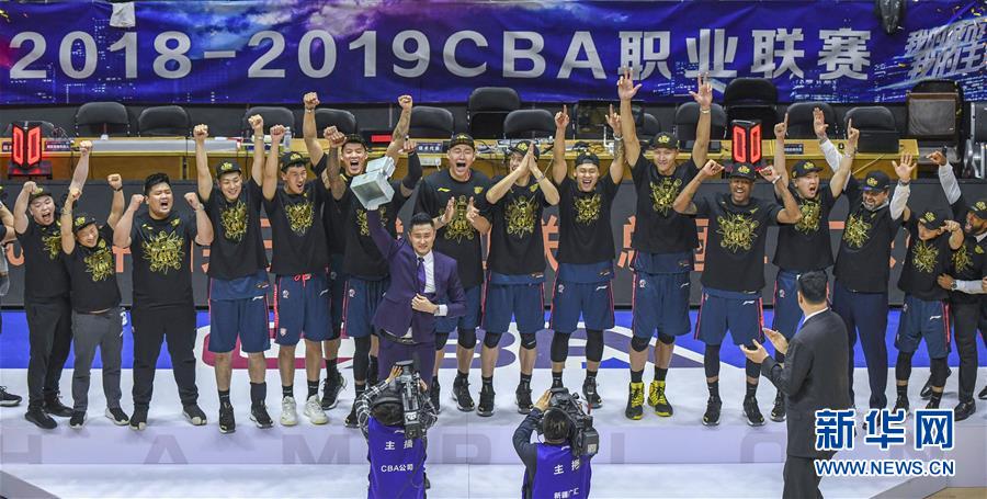 5月3日,广东东莞银行队庆祝夺得总冠军。 当日,在2018-2019赛季中国男子篮球职业联赛(CBA)总决赛第四回合比赛中,广东东莞银行队客场以103比98战胜新疆广汇汽车队,夺得总决赛冠军。 新华社记者赵戈摄