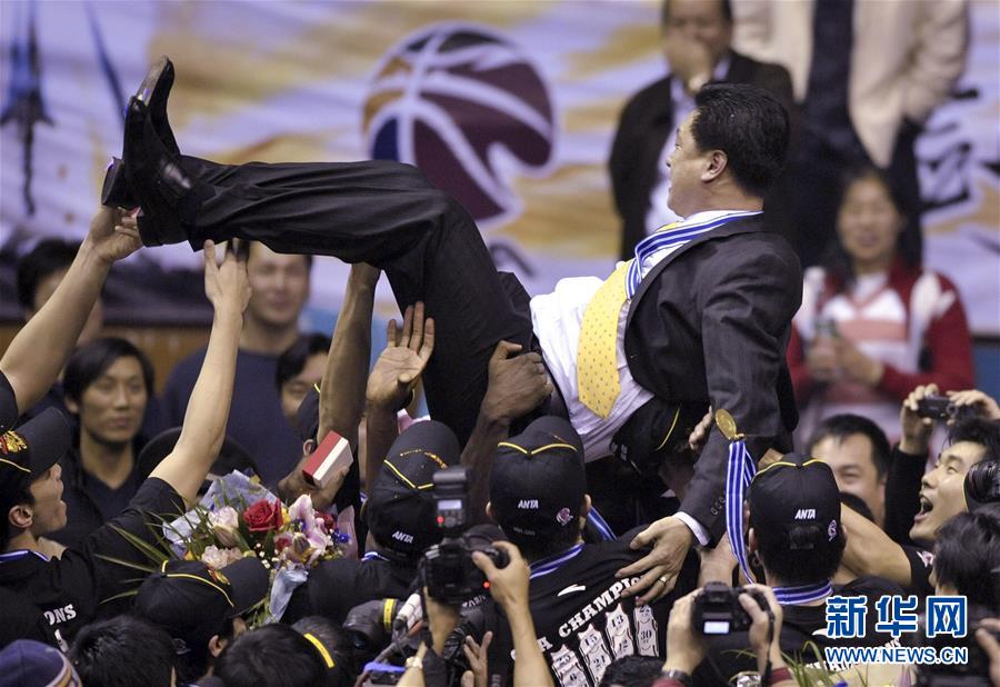 这是广东宏远队主教练李春江被球员高高抛起庆祝。 新华社记者 刘大伟 摄