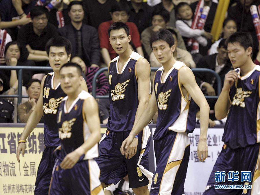 2005年4月24日,在2004-2005赛季CBA总决赛第五场比赛中,广东宏远队客场以107比99战胜江苏南钢队,夺得冠军。这是广东宏远队球员在比赛暂停后上场。新华社记者 李岳 摄