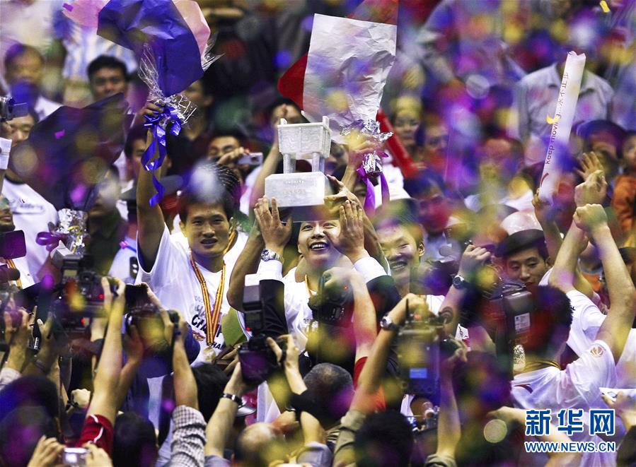 2006年4月19日,在2005-2006赛季CBA总决赛第五场比赛中,广东宝玛仕队主场以88比81战胜八一双鹿队,夺得冠军。这是广东宝玛仕队球员易建联(中)在颁奖仪式上举起冠军鼎庆祝。新华社发