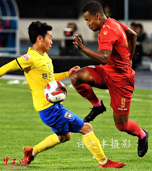 2019年5月4日晚,北京奥体中心体育场,中甲联赛第8轮比赛,北京北体大队主场以3比0战胜陕西大秦之水队。比赛第28分钟,北京北体大队9号林斯一脚射门打入第一球。第69分钟,北京北体大队27号邹仲霆接角球头球攻入第二球。第76分钟,北京北体大队左路进攻29号韩毅头球冲顶打入第三球。图为双方的比赛瞬间。工人日报-中工网许之丰摄影报道
