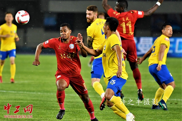 2019年5月4日晚,北京奥体中心体育场,中甲联赛第8轮比赛,北京北体大队主场以3比0战胜陕西大秦之水队。比赛第28分钟,北京北体大队9号林斯一脚射门打入第一球。第69分钟,北京北体大队27号邹仲霆接角球头球攻入第二球。第76分钟,北京北体大队左路进攻29号韩毅头球冲顶打入第三球。图为双方的比赛瞬间。工人日报-中工网许之丰摄影报道