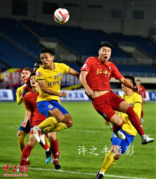 2019年5月4日晚,北京奥体中心体育场,中甲联赛第8轮比赛,北京北体大队主场以3比0战胜陕西大秦之水队。比赛第28分钟,北京北体大队9号林斯一脚射门打入第一球。第69分钟,北京北体大队27号邹仲霆接角球头球攻入第二球。第76分钟,北京北体大队左路进攻29号韩毅头球冲顶打入第三球。图为双方的比赛瞬间。工人日报-中工网许之丰摄影报道