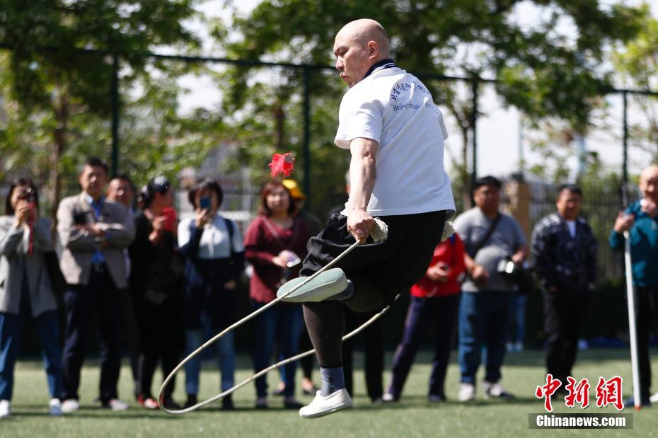 5月5日,“温故知心·铸魂逐梦”北京演艺集团成立十周年系列活动之中国杂技团公众开放日举行。活动旨在宣传杂技艺术、展现非遗文化,提高观众对优秀传统文化的认知度和参与度。图为非遗项目“宋氏踢毽”代表性传承人井小毅向观众展示踢键儿技艺。中新社记者 富田 摄