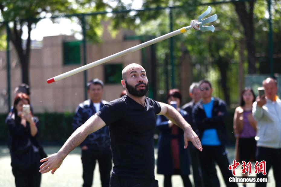 5月5日,“温故知心·铸魂逐梦”北京演艺集团成立十周年系列活动之中国杂技团公众开放日举行。活动旨在宣传杂技艺术、展现非遗文化,提高观众对优秀传统文化认知度和参与度。图为杂技团的巴西演员古集蒙向观众展示非遗项目“王氏飞叉”,古集蒙来中国十年,学习飞叉已有七年时间。中新社记者 富田 摄