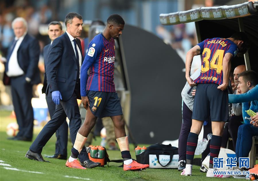 5月4日,巴塞罗那队球员登贝莱(左二)在比赛中受伤离场。 当日,在2018-2019赛季西班牙足球甲级联赛第36轮比赛中,塞尔塔队主场以2比0战胜巴塞罗那队。 新华社/法新