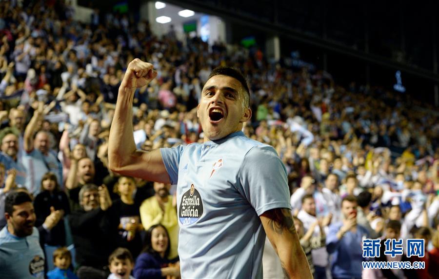 5月4日,塞尔塔队球员马克西·戈麦斯在进球后庆祝。 当日,在2018-2019赛季西班牙足球甲级联赛第36轮比赛中,塞尔塔队主场以2比0战胜巴塞罗那队。 新华社/法新