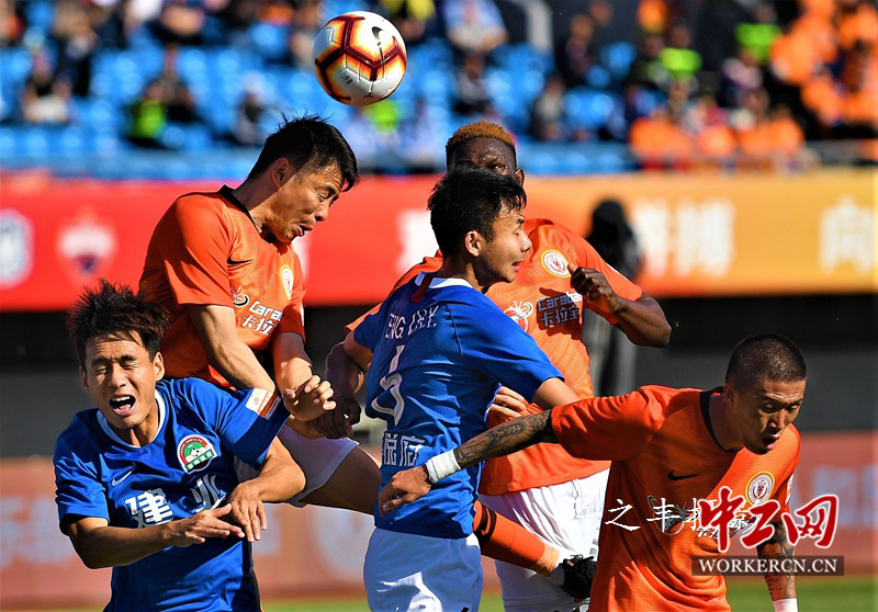 2019年5月5日,北京丰台体育中心,中超第8轮比赛北京人和队主场以1比2负于河南建业队。比赛第17分钟,迪奥普造点并主罚命中为人和队取得领先。第25分钟,河南队10号巴索戈单刀破门扳平比分。下半场第50分钟,河南队冯卓毅头球破门反超比分。北京人和队员陈杰为本队迎来了第200场比赛。图为双方的比赛瞬间。工人日报-中工网许之丰摄影报道