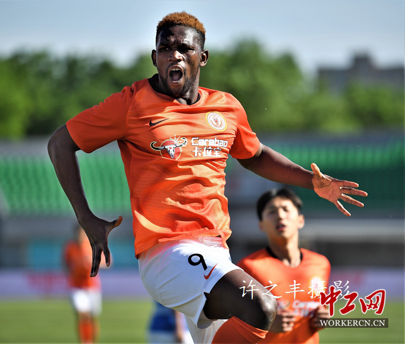 2019年5月5日,北京丰台体育中心,中超第8轮比赛北京人和队主场以1比2负于河南建业队。比赛第17分钟,迪奥普造点并主罚命中为人和队取得领先。第25分钟,河南队10号巴索戈单刀破门扳平比分。下半场第50分钟,河南队冯卓毅头球破门反超比分。北京人和队员陈杰为本队迎来了第200场比赛。图为双方的比赛瞬间。工人日报-中工网许之丰摄影报道