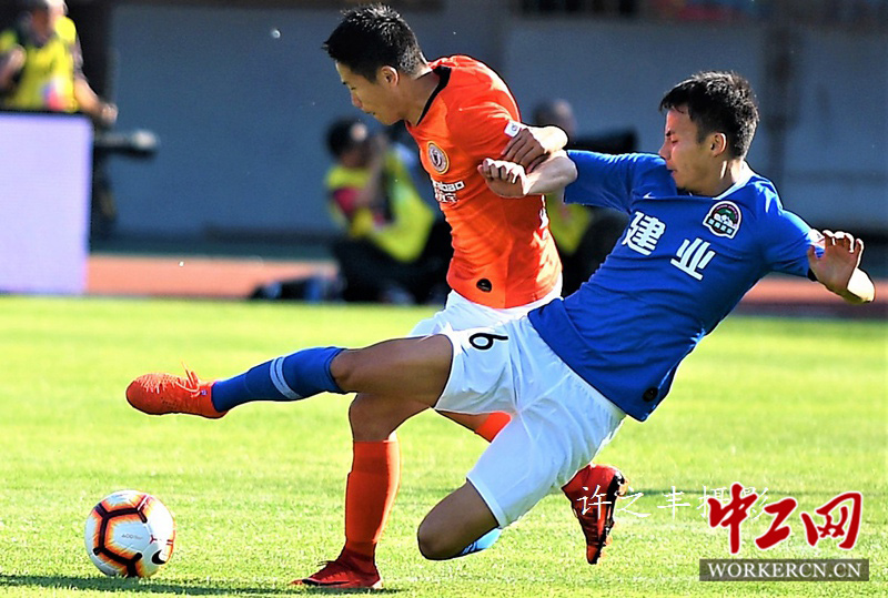2019年5月5日,北京丰台体育中心,中超第8轮比赛北京人和队主场以1比2负于河南建业队。比赛第17分钟,迪奥普造点并主罚命中为人和队取得领先。第25分钟,河南队10号巴索戈单刀破门扳平比分。下半场第50分钟,河南队冯卓毅头球破门反超比分。北京人和队员陈杰为本队迎来了第200场比赛。图为双方的比赛瞬间。工人日报-中工网许之丰摄影报道