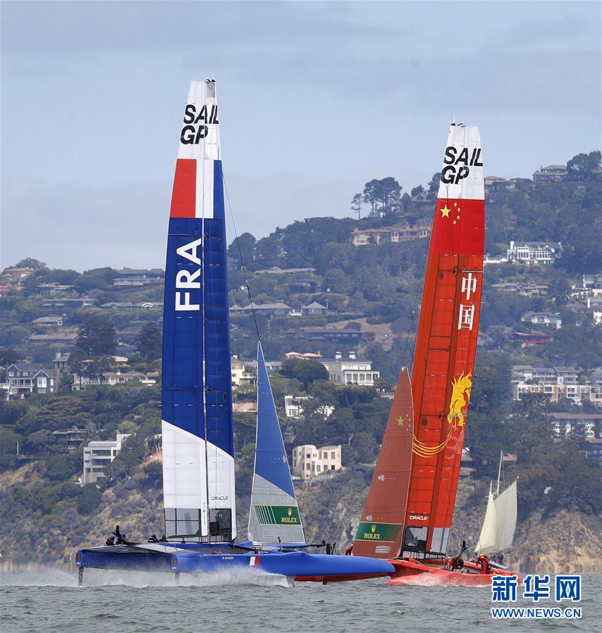 5月5日,中国队帆船(右)在比赛中。 当日,2019国际帆船大奖赛旧金山站比赛落幕,最终澳大利亚队获得冠军,中国队获得第六名。 新华社发(董旭东摄)