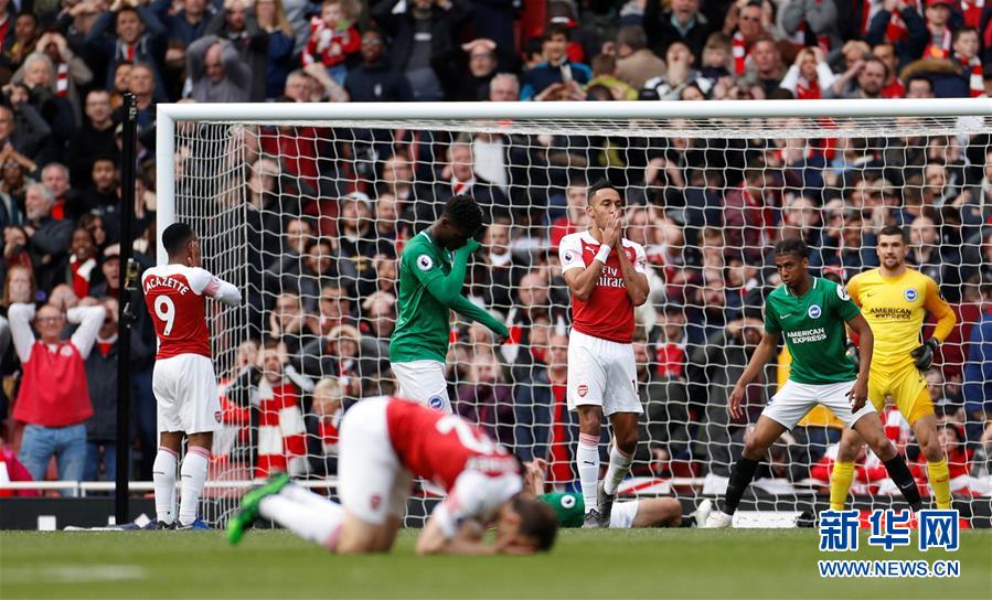 5月5日,阿森纳队球员奥巴梅杨(右三)错失进球机会后神情低落。 当日,在2018-2019赛季英格兰足球超级联赛第37轮比赛中,阿森纳队主场以1比1战平布莱顿队。 新华社/路透
