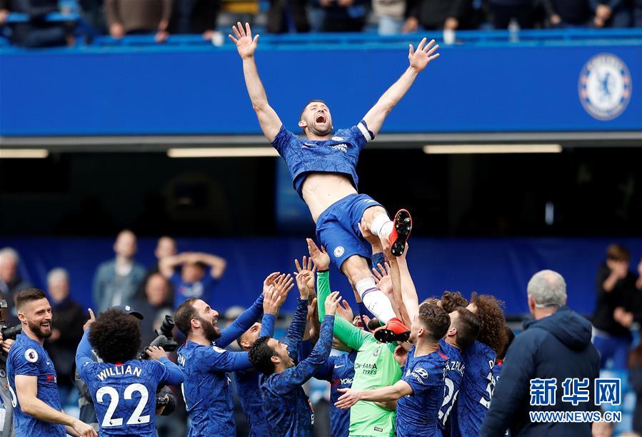 5月5日,切尔西队球员卡希尔(上)被队友抛起庆祝。 当日,在2018-2019赛季英格兰足球超级联赛第37轮比赛中,切尔西队主场以3比0战胜沃特福德队。 新华社/路透
