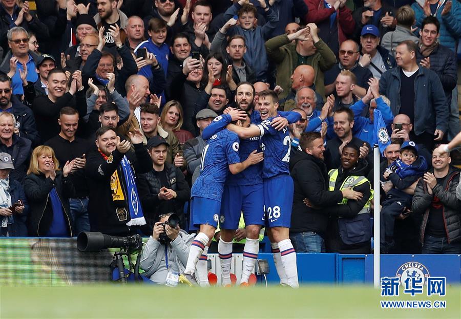 5月5日,切尔西队球员伊瓜因(中)进球后与队友庆祝。 当日,在2018-2019赛季英格兰足球超级联赛第37轮比赛中,切尔西队主场以3比0战胜沃特福德队。 新华社/路透
